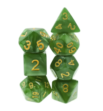 Introducing our Acrylic Pearl Grass Green Dice with Gold Lettering, a set of polyhedral dice that effortlessly combines the serenity of nature with the allure of luxury. Crafted from high-quality acrylic, each die in this set showcases a captivating pearl grass green hue, reminiscent of lush meadows and serene landscapes. Our Acrylic Pearl Grass Green Dice with Gold Lettering set includes all the essential polyhedral dice needed for your tabletop role-playing adventures, from the iconic 20-sided die for crucial actions to the reliable 6-sided die for standard rolls.