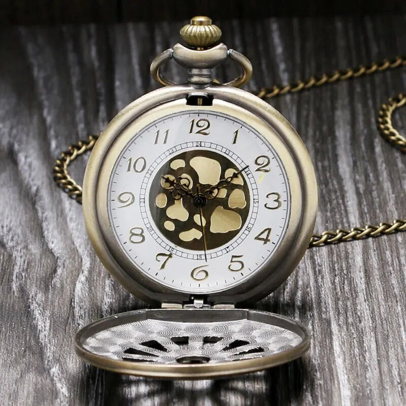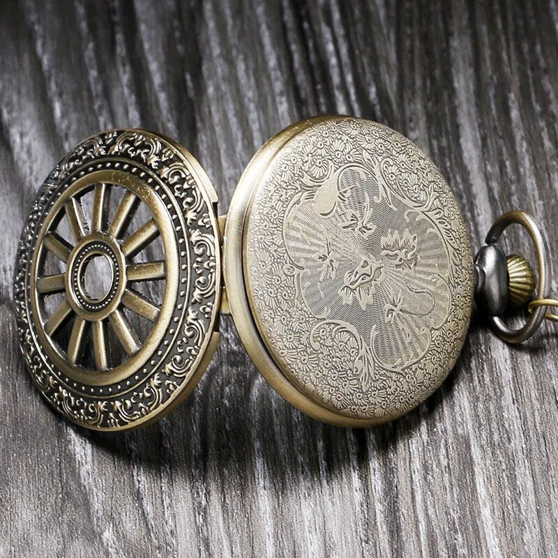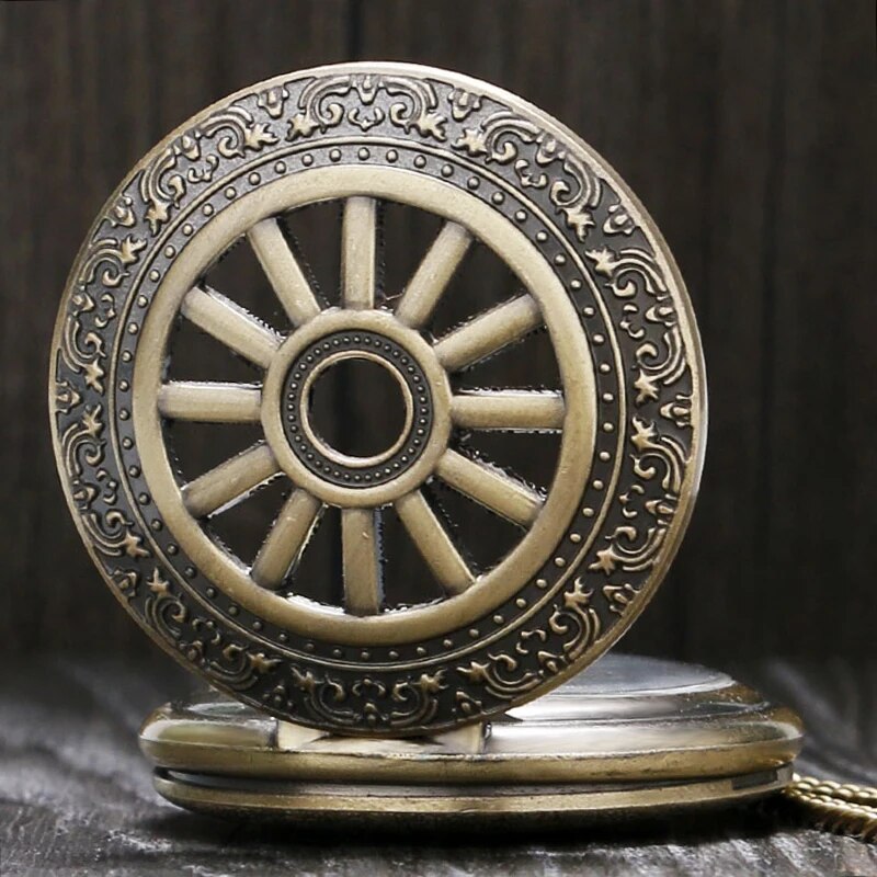 Introducing our Bronze Wagon Wheel Pocketwatch – a timepiece that beautifully encapsulates the spirit of the Old West and rustic charm. This pocketwatch is a blend of vintage aesthetics and practicality, designed for those who appreciate classic craftsmanship and a touch of frontier nostalgia.